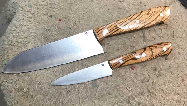 Grant makes a wide range of knives, from reproductions of antique collectors’ bowies and daggers, to exceptional kitchen knives known for balance, lightness and long-lasting edges. Grant makes his own patterned steel (Damascus) and forges steel from bearings, engine shafts and saw blades, as well as the best stainless steels on the market.