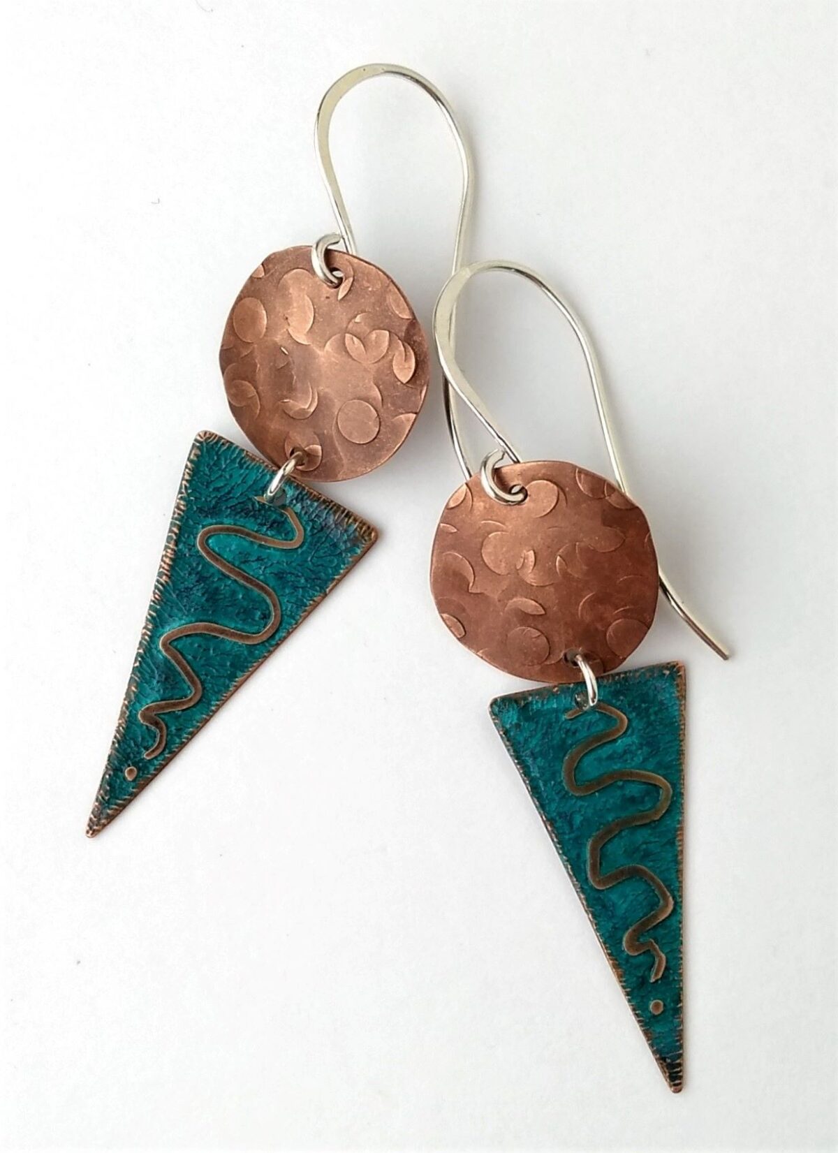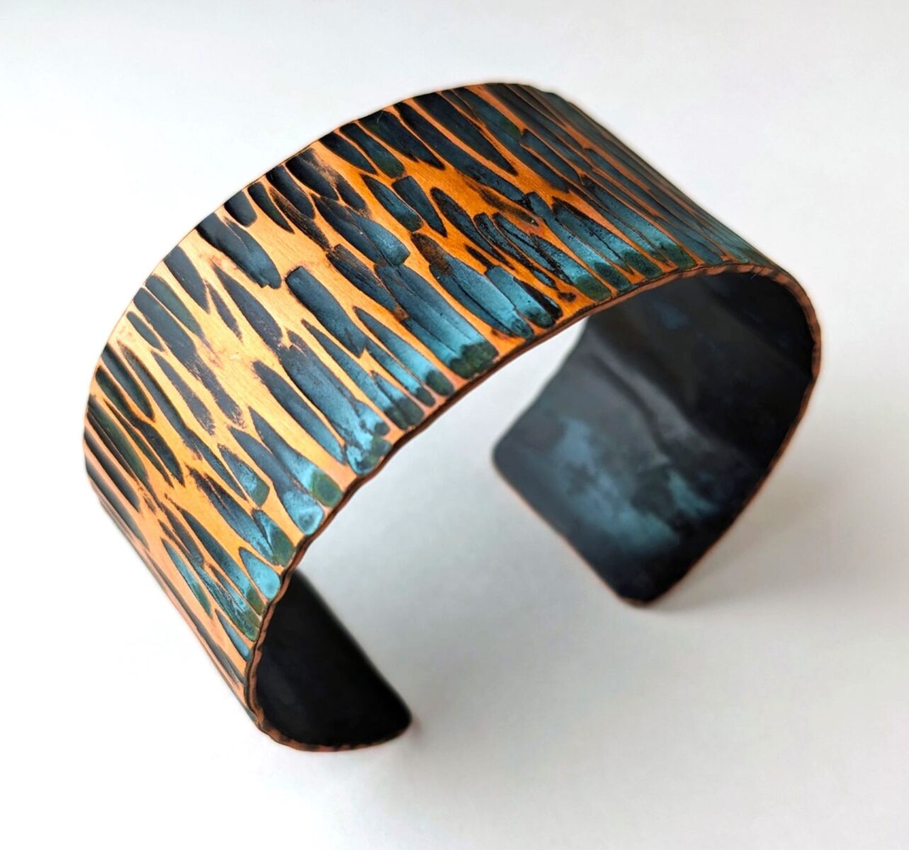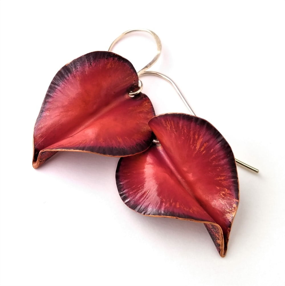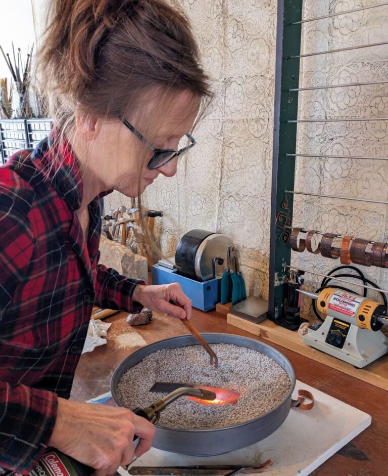“I am fascinated by the transformation of copper under my hammer; the shapes and texture that are created speak of the earth from which the copper is born. I look to the colours and textures that surround me in the natural world – the sparkle of green on a touch of moss, the crumple of red in an autumn leaf – to inspire and infuse my work.  Come see my world transformed into wearable pieces of art.”