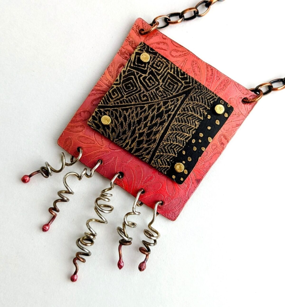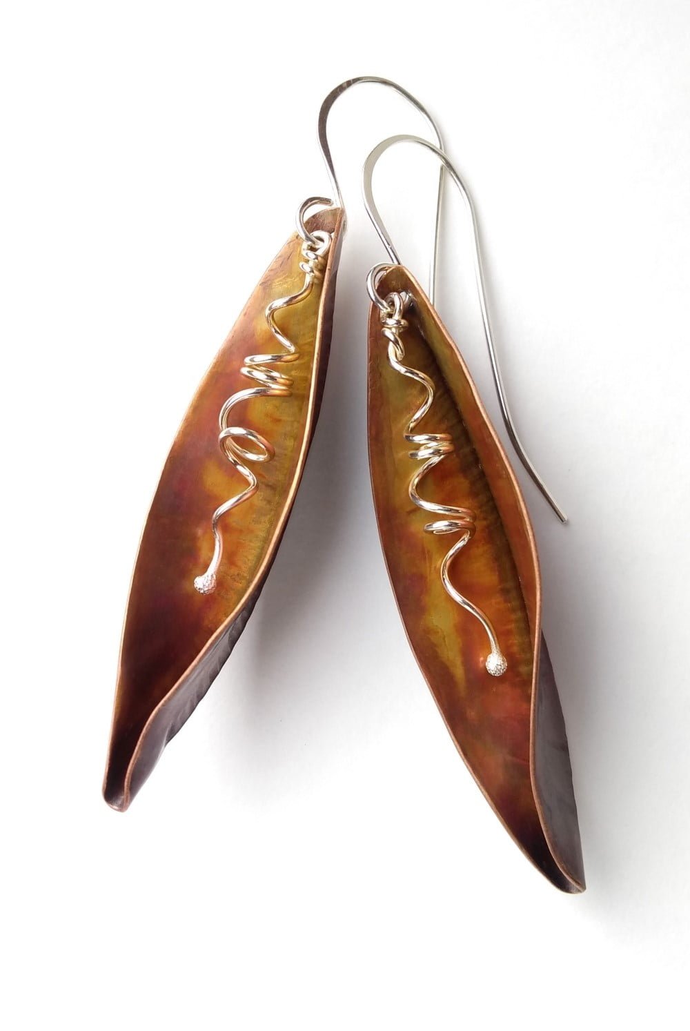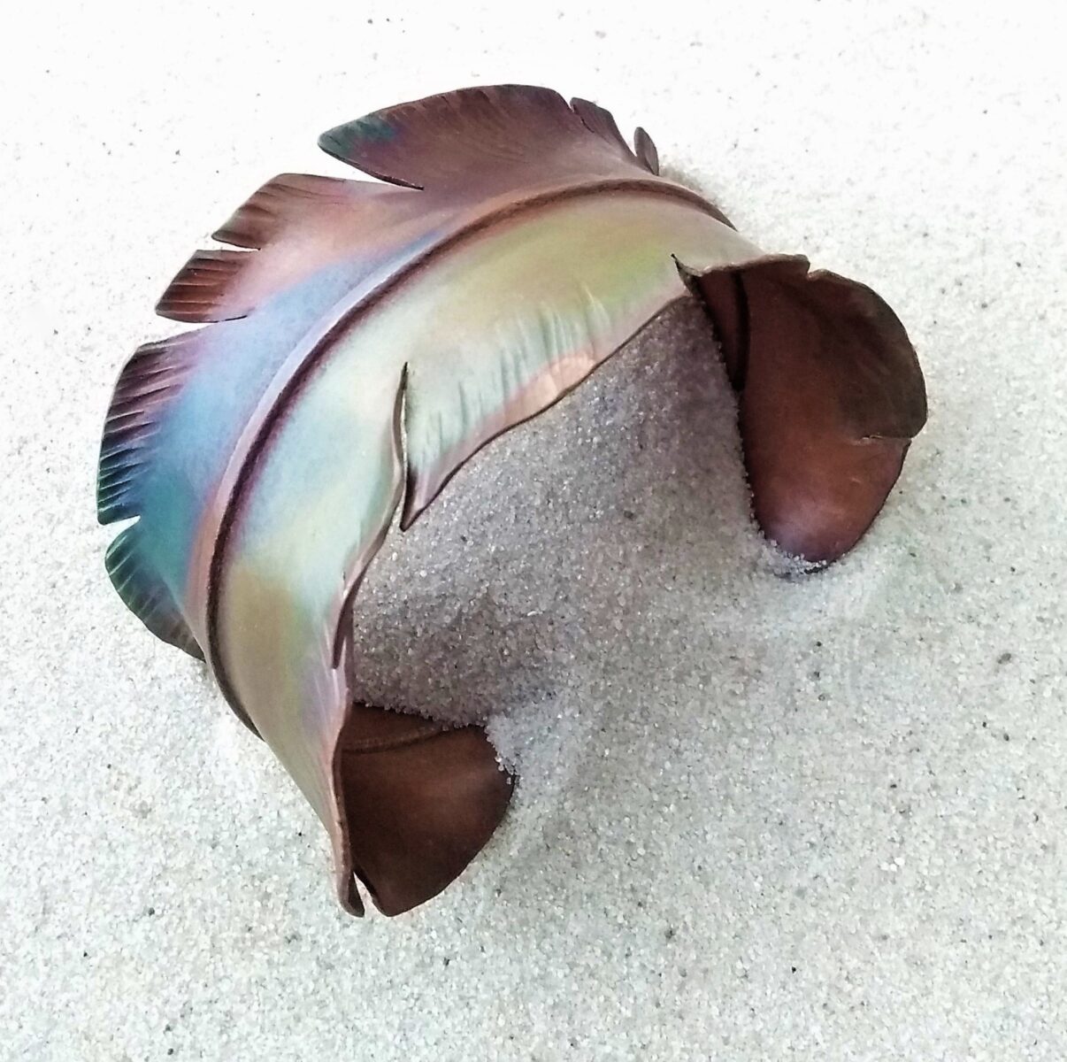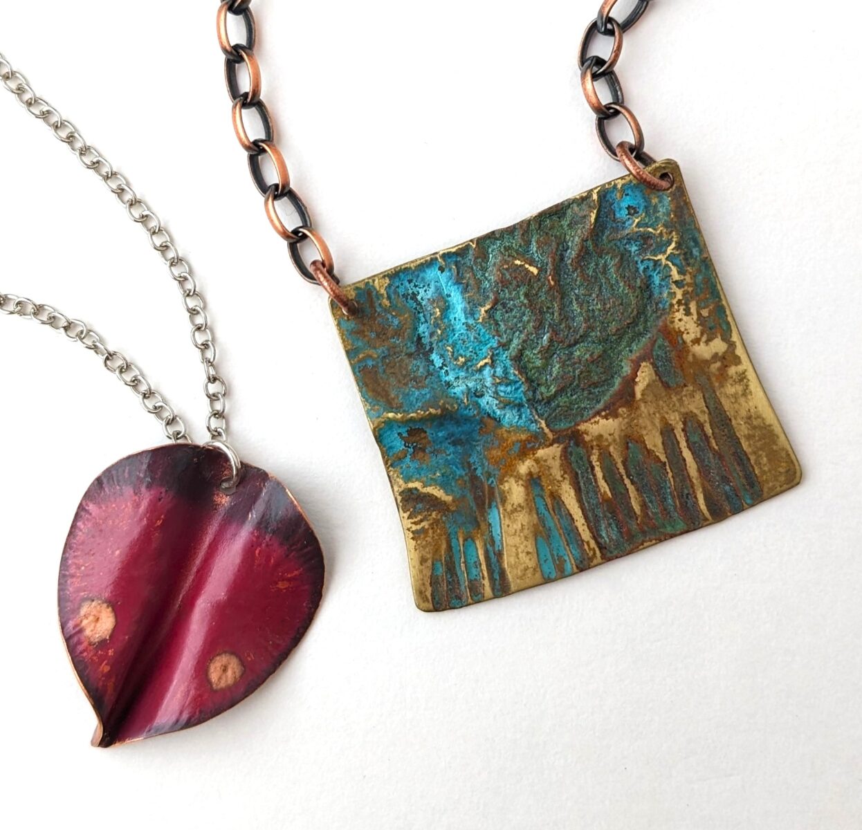 “I am fascinated by the transformation of copper under my hammer; the shapes and texture that are created speak of the earth from which the copper is born. I look to the colours and textures that surround me in the natural world – the sparkle of green on a touch of moss, the crumple of red in an autumn leaf – to inspire and infuse my work.  Come see my world transformed into wearable pieces of art.”